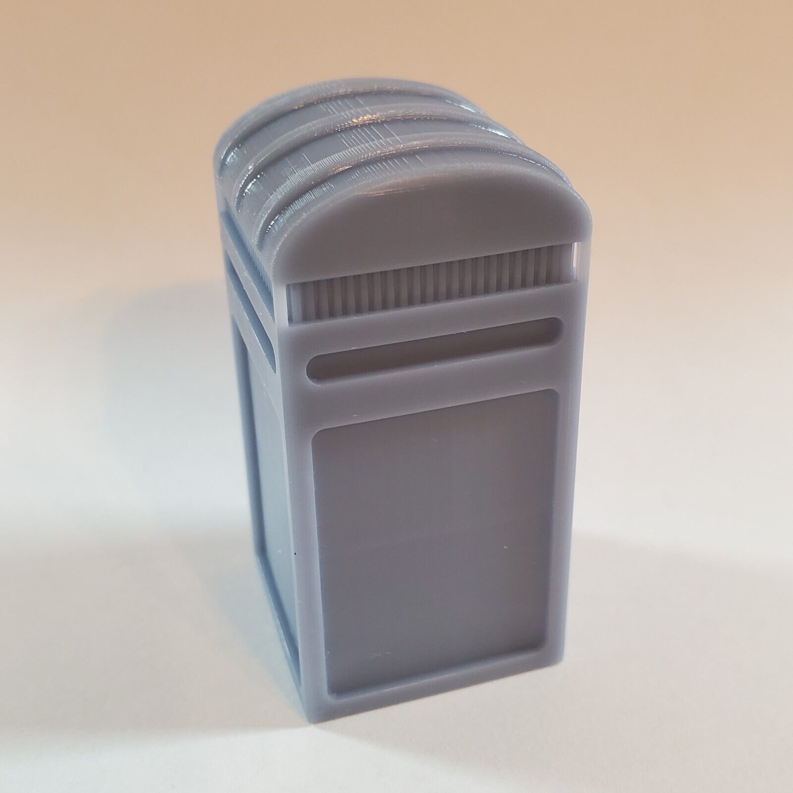 These models represent N scale (1:160) portable toilets. Each measures 0.29" wide, 0.3" deep and 0.58" tall. They are 3D printed in high quality resin which provides better details and less surface atifacts than other common types of 3D printing. All they need is some paint and they're ready for placement.
